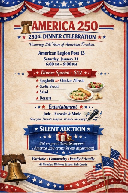 Americas 250 Dinner at Post 13 $12 Spaghetti or Chicken Alfredo, Garlic Bread, Salad and dessert. Karaoke and music with a silent auction